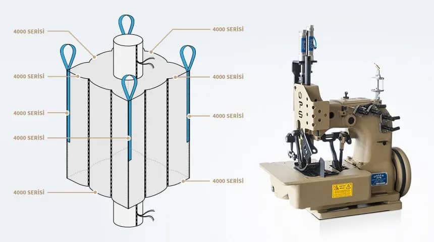 Серия 4000 разработанная для производства FIBC (биг-бэгов) со шнуром при помощи шва оверлок + цепной стежок. Машина с двойным продвижением ткани, оборудованная верхними и нижними зубьями. Машина можеть быть оборудована горячим ножом для обрезки шнура и нитей.