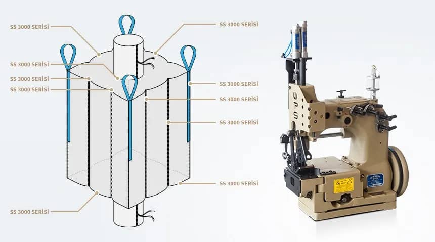 Серия SS 3000 разработана для зашивки полипропиленовых тканей большой плотности, биг-бэгов со шнуром при помощи двойного цепного стежка. Машина с двойным продвижением ткани, оборудованная верхними и нижними зубьями.