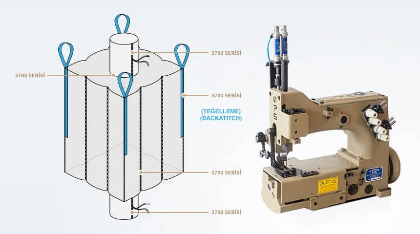 Серия 3700 разработана для шитья легких и средних тканей. Используется для зашивки горловины и строп у биг-бэгов. Машина с верхей и нижней подачей шнура-наполнителя (filler cord). Машина с двойным продвижением ткани, оборудованная верхними и нижними зубьями.