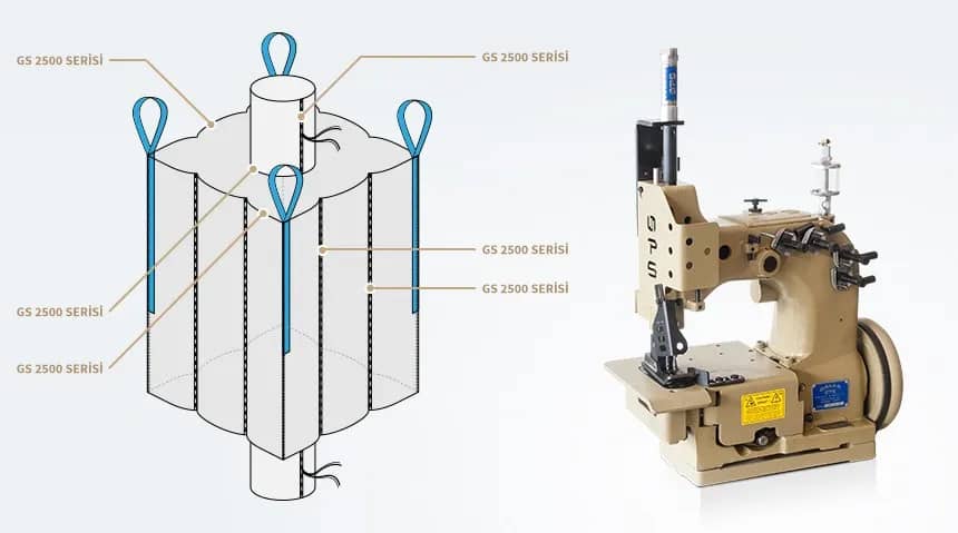 Серия GS 2500 разработана для шитья легких и средних тканей. Используется для пришивания горловины и зашивки ребер жесткости, а также боковых швов нижней и верхней горловины мешка. Он не подходит для ламинированных тканей, так как имеет только нижние продвижение ткани.