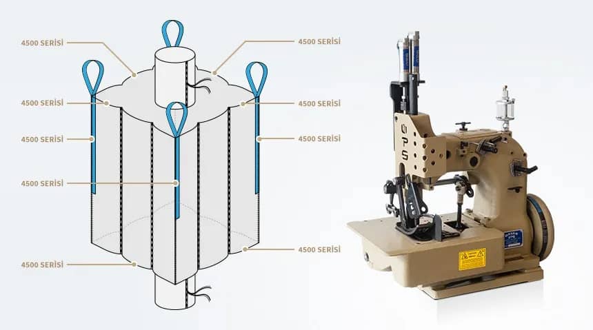 Серия 4500 разработанная для производства FIBC (биг-бэгов) при помощи шва оверлок. Машина с двойным продвижением ткани, оборудованная верхними и нижними зубьями.